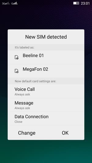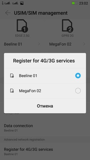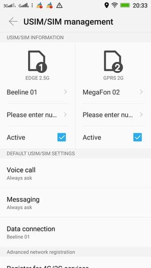 Смартфон поддерживает работу с двумя SIM-картами, организация работы с ними удобна, все настройки собраны на одной странице, разобраться несложно даже при условии отсутствия перевода части меню на русский язык. Любую из SIM-карт можно назначить основной для осуществления голосовых звонков, передачи данных или отправки SMS-сообщений. Можно выбрать желаемую карту прямо в момент вызова или набора SMS. Разъемы для SIM-карт равнозначны по своим возможностям, скоростную передачу данных в сетях 3G (4G) поддерживает любой слот, переключение карт осуществляется прямо из меню без необходимости физической смены слотов.