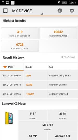 По итогам тестирования платформа Lenovo K3 Note показала ожидаемо высокие результаты, используемая в смартфоне платформа уже не раз до этого доказывала свои лидирующие позиции в среднем сегменте среди популярных SoC. Эта 64-разрядная платформа демонстрирует очень хорошие, гораздо выше привычного среднего уровня результаты. Производительность у смартфонов, основанных на платформах MediaTek нового поколения, уже вплотную подбирается к уровню флагманскому. SoC MediaTek MT6752 не рассчитана на использование в дорогих топовых смартфонах, она предназначена для аппаратов среднего класса, однако ее мощностей, в том числе и производительности видеоподсистемы Mali-T760 еще долго будет хватать для выполнения любых поставленных задач, в том числе и требовательных игр. На текущий момент платформа MediaTek MT6752, пожалуй, является наиболее интересным решением для среднего уровня, поскольку смартфоны на ней оказываются дешевле, чем на конкурирующей Qualcomm Snapdragon 615, а в плане производительности значительно опережают ее.