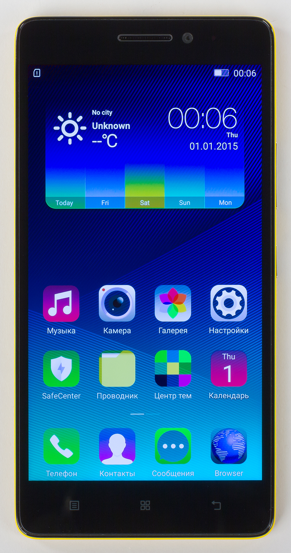 Смартфон выпускается в трех основных вариантах цветового исполнения корпуса: помимо стандартных черного и белого имеется еще и необычный ярко-желтый лимонный окрас, который выглядит ярко и радует глаз. Все покрытия, как уже было сказано, имеют легкий металлический блеск, что придает простенькой используемой здесь пластмассе больше привлекательности.