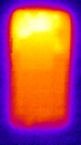 Видно, что нагрев выраженно локализован в верхней части аппарата, что, видимо, соответствует расположению микросхемы SoC. По данным теплокамеры, максимальный нагрев составил 43 градуса (при температуре окружающего воздуха в 24 градуса). Такой нагрев нельзя назвать незначительным.