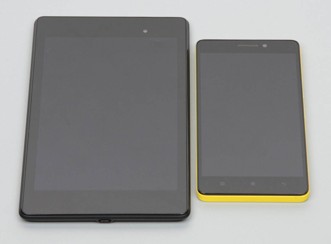 Лицевая поверхность экрана выполнена в виде стеклянной пластины с зеркально-гладкой поверхностью, устойчивой к появлению царапин. Судя по отражению объектов антибликовые свойства экрана не хуже, чем у экрана Google Nexus 7 (2013) (далее просто Nexus 7). Для наглядности приведем фотографию, на которой в выключенных экранах отражается белая поверхность (слева — Nexus 7, справа — Lenovo K3 Note, далее их можно различать по размеру):