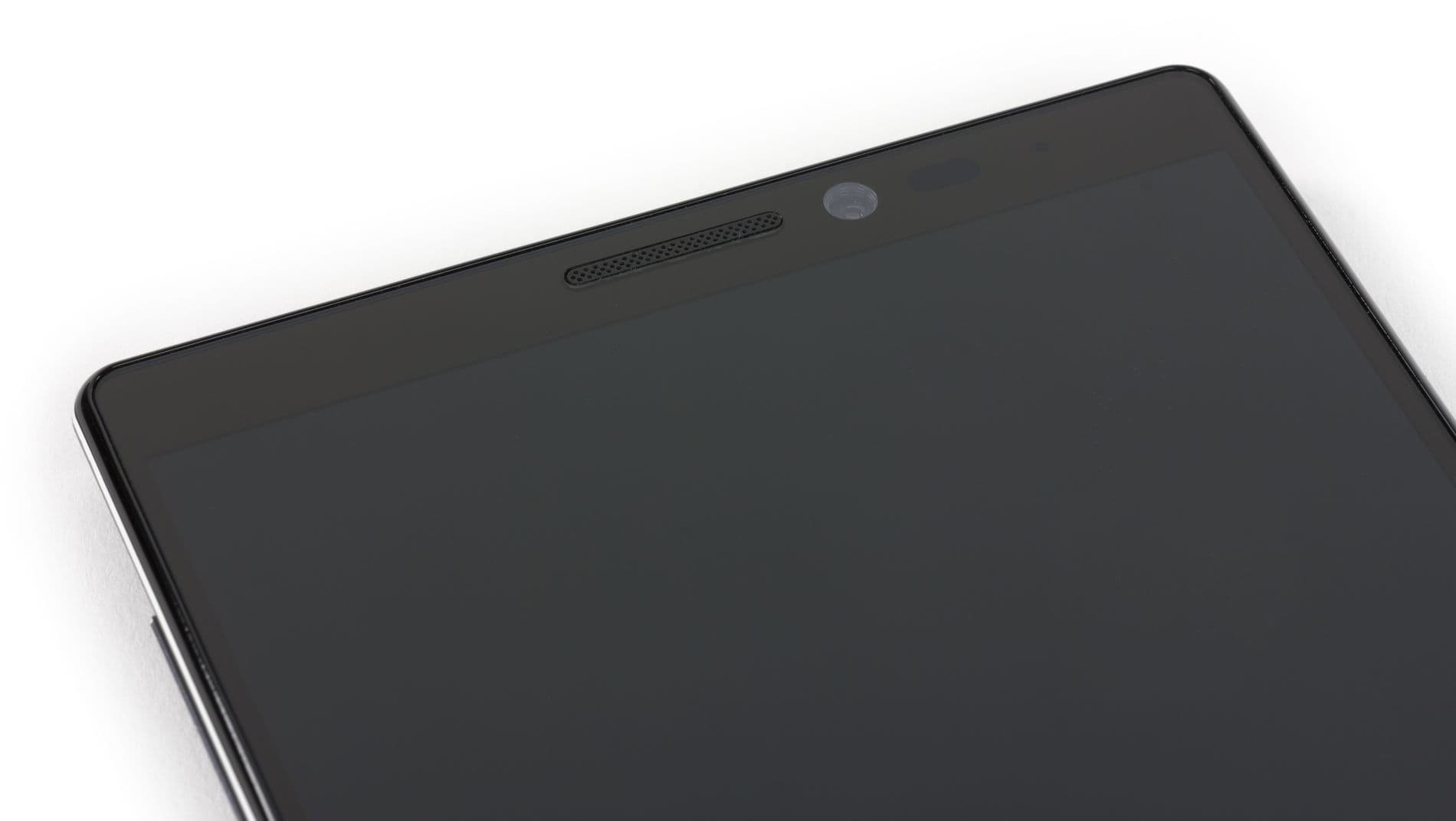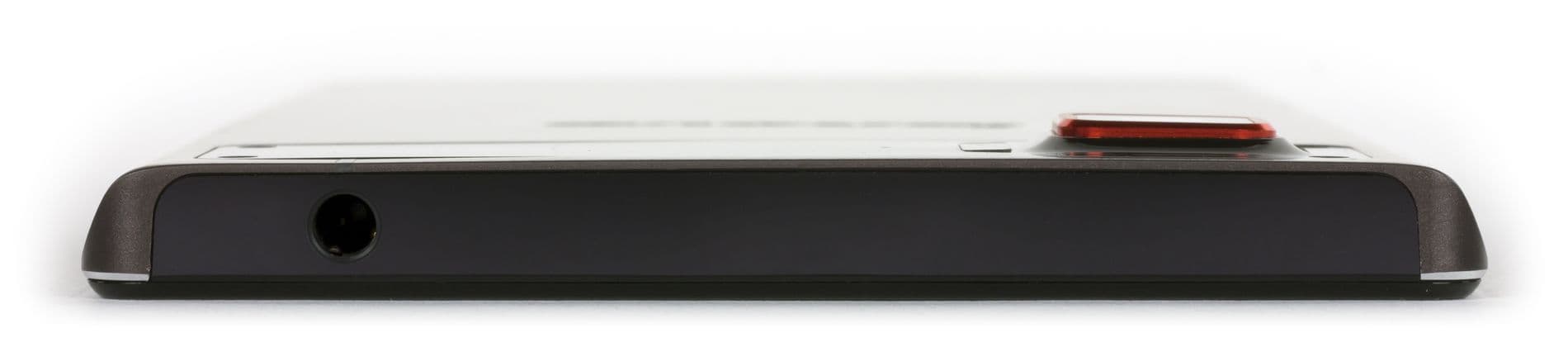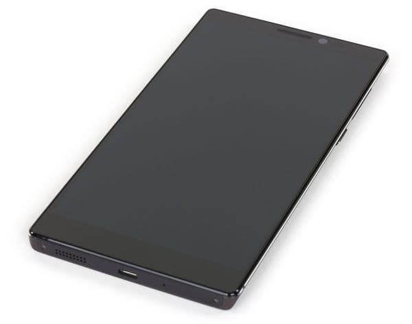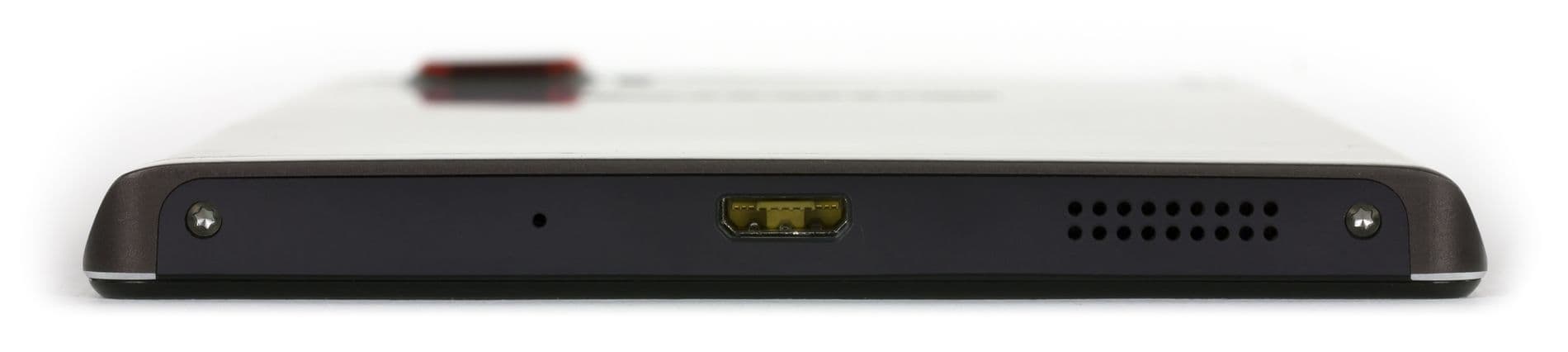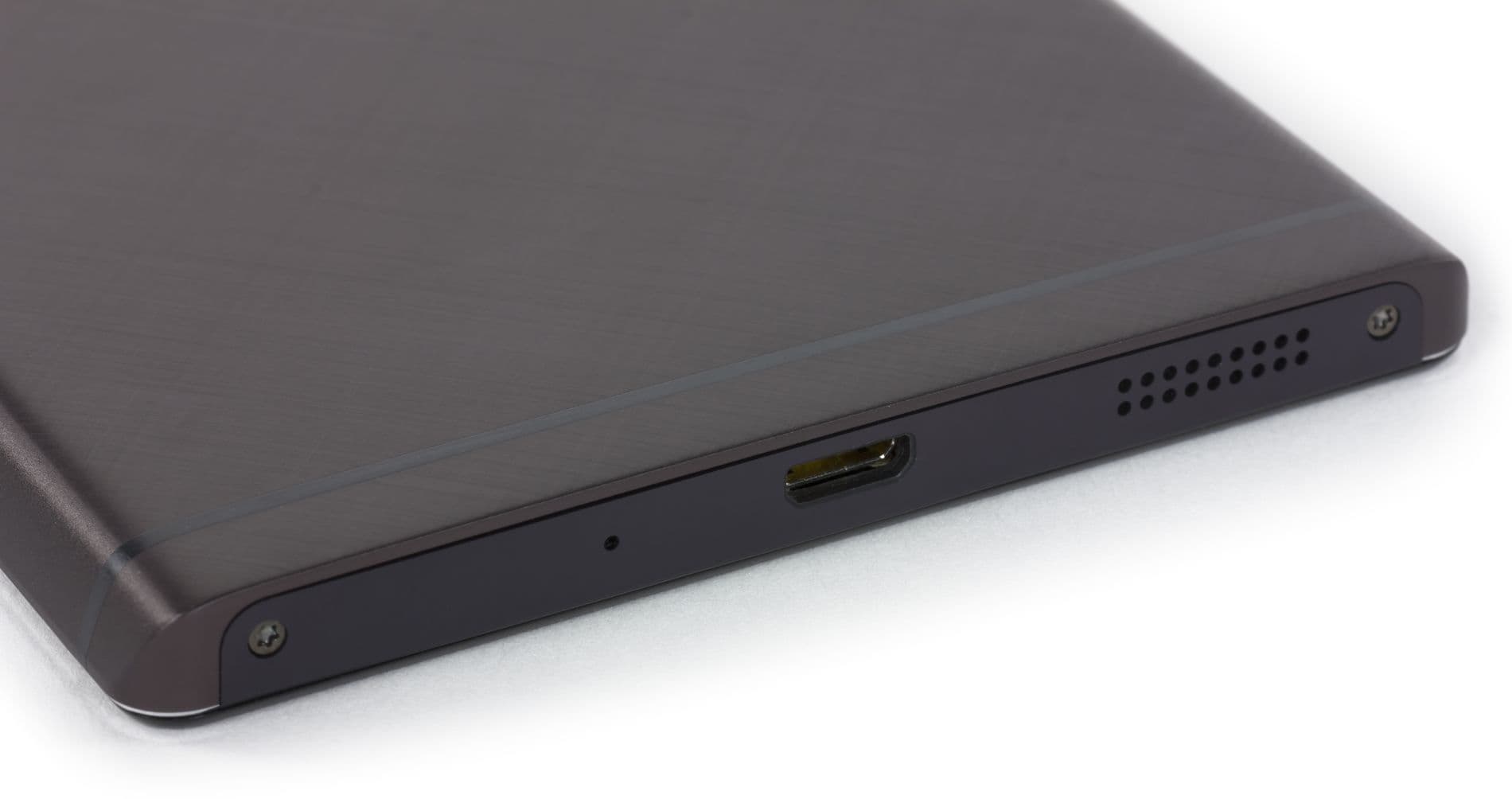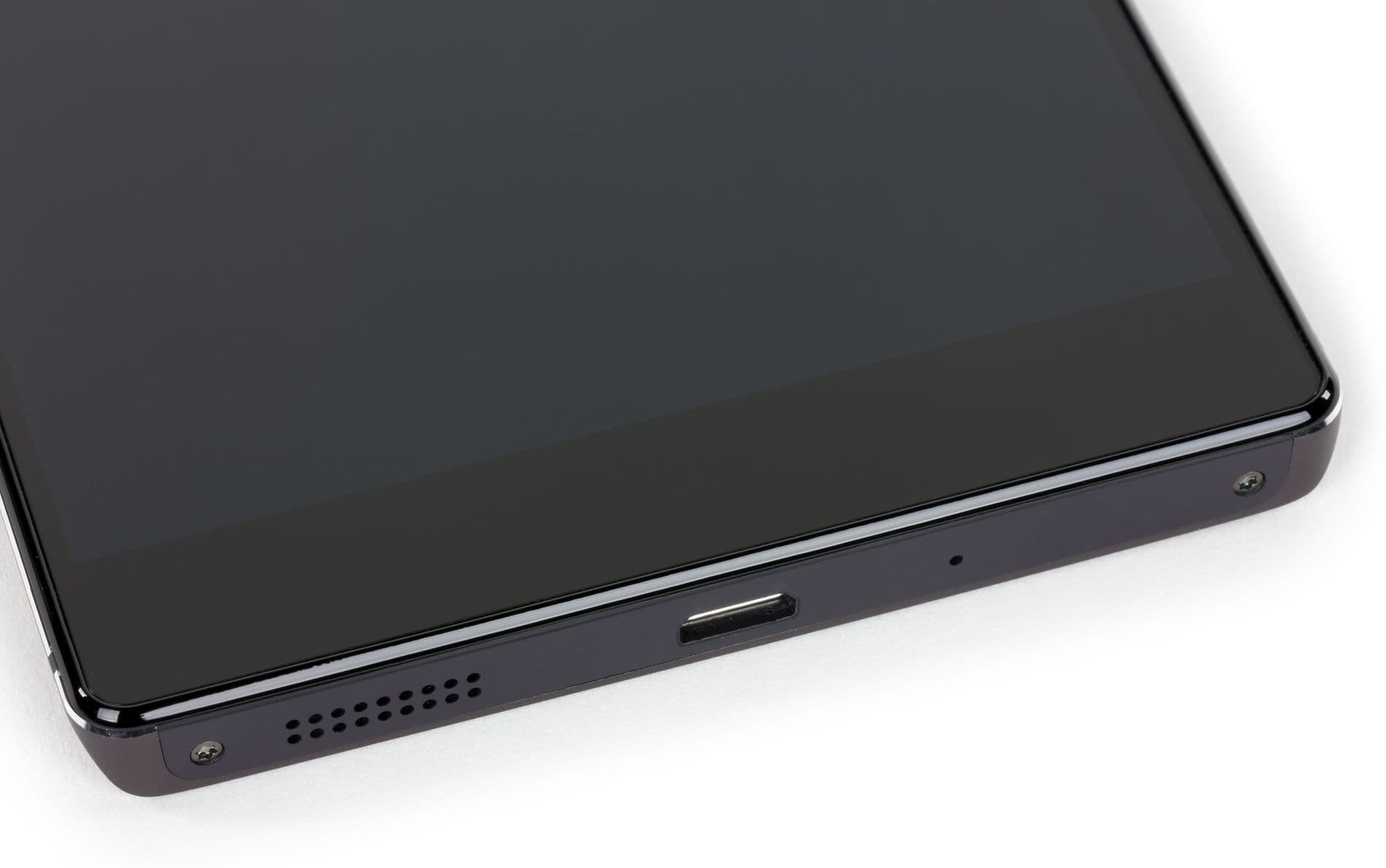 На таких же винтах прикручена к нижнему торцу еще одна панель, на которой размещены универсальный разъем Micro-USB, микрофон и решетка основного динамика. Решетка представляет собой массив из небольших круглых отверстий; за счет торцевого размещения динамика звук не перекрывается поверхностью стола, как бы смартфон ни лежал. Поддерживается подключение к порту USB внешней периферии и флэш-накопителей с помощью специального OTG-переходника.