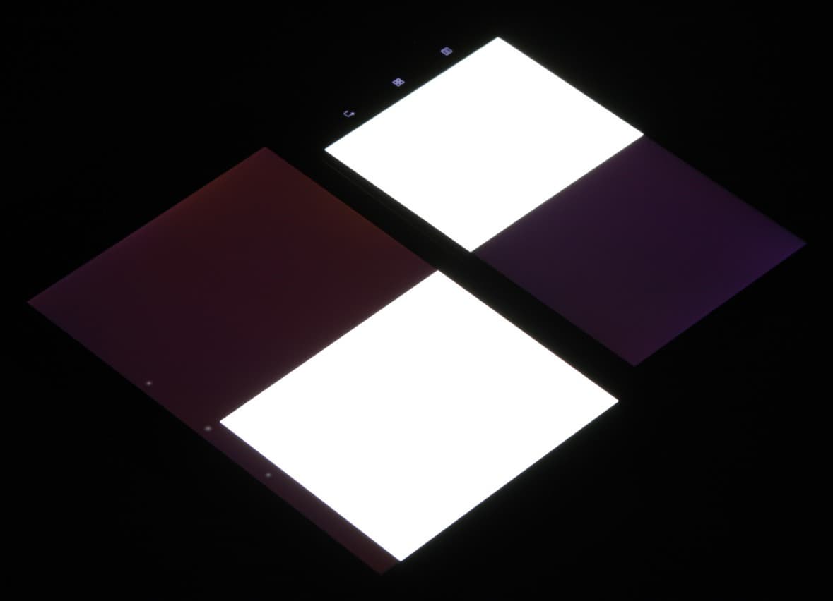 Яркость под углом у экранов уменьшилась (как минимум в 5 раз, исходя из разницы в выдержке), но в случае Lenovo VIBE Z2 Pro падение яркости чуть больше. Черное поле при отклонении по диагонали высветляется слабо и приобретает красно-фиолетовый оттенок или остается почти нейтрально-серым. Фотографии ниже это демонстрируют (яркость белых участков в перпендикулярном плоскости экранов направлении примерно одинаковая!):