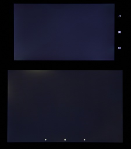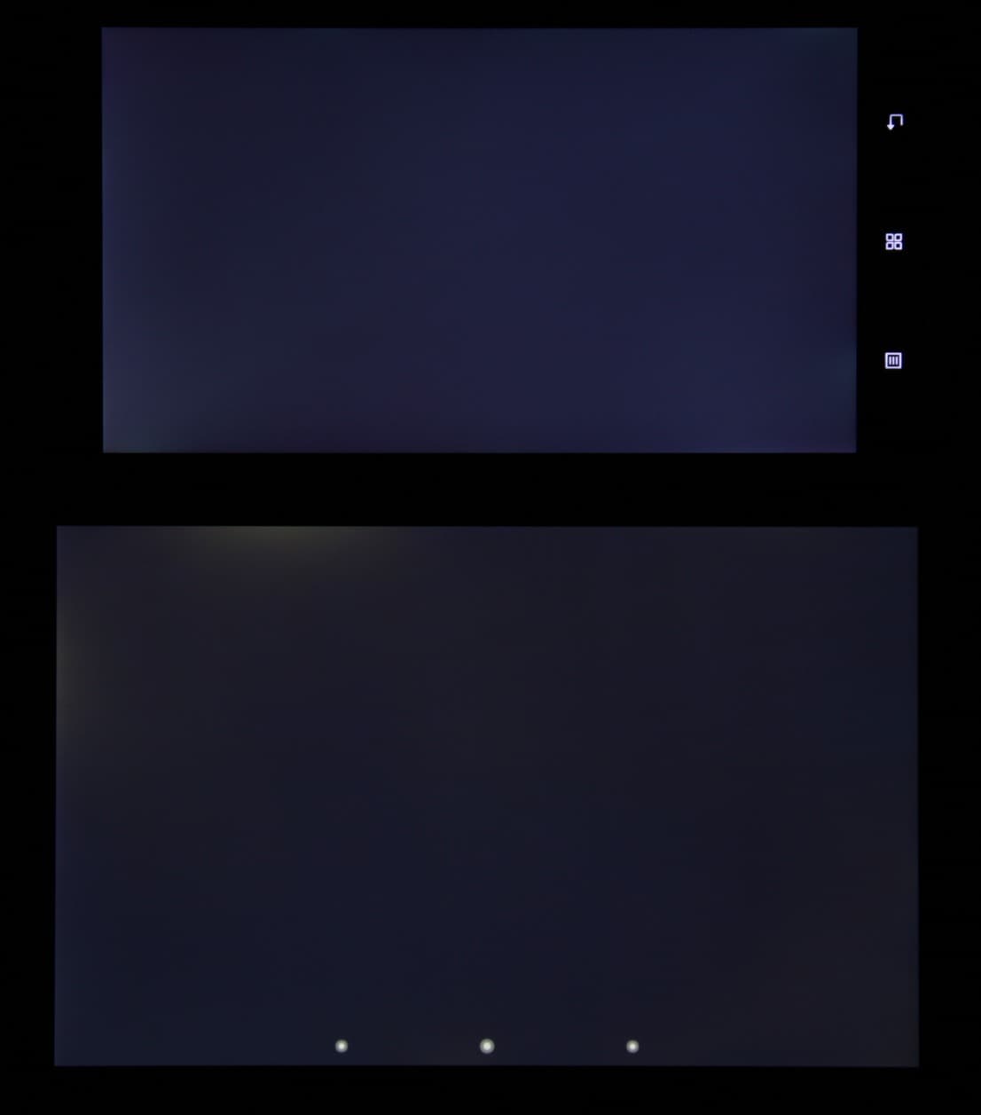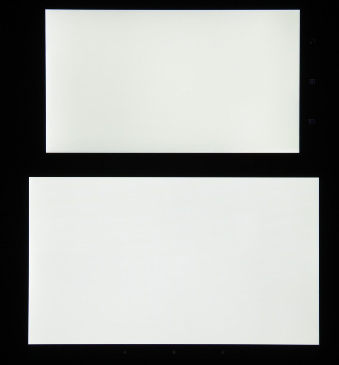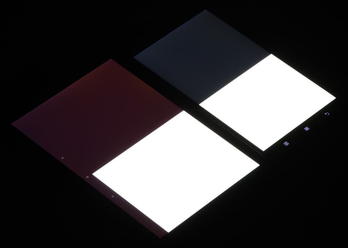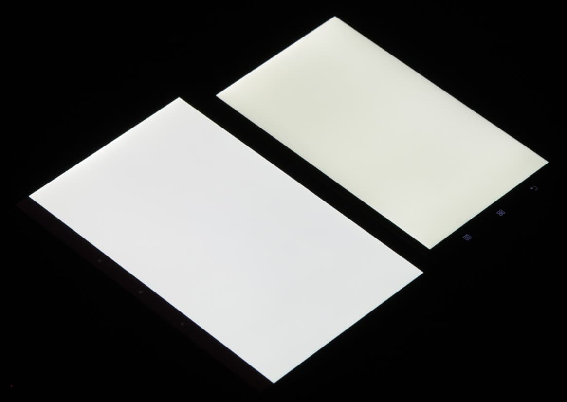 Экран имеет хорошие углы обзора без значительного сдвига цветов даже при больших отклонениях взгляда от перпендикуляра к экрану и без инвертирования оттенков. Для сравнения приведем фотографии, на которых на экраны Lenovo VIBE Z2 Pro и Nexus 7 выведены одинаковые изображения, при этом яркость экранов изначально установлена примерно на 200 кд/м² (по белому полю во весь экран), а цветовой баланс на фотоаппарате принудительно переключен на 6500 К. Перпендикулярно к экранам белое поле: