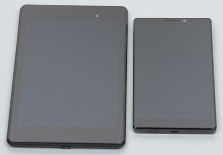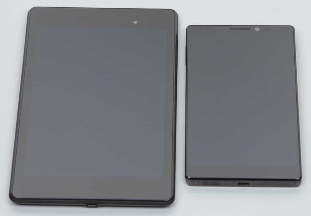 Лицевая поверхность экрана выполнена в виде стеклянной пластины с зеркально-гладкой поверхностью, устойчивой к появлению царапин. Судя по отражению объектов антибликовые свойства экрана не хуже, чем у экрана Google Nexus 7 (2013) (далее просто Nexus 7). Для наглядности приведем фотографию, на которой в выключенных экранах отражается белая поверхность (слева — Nexus 7, справа — Lenovo VIBE Z2 Pro, далее их можно различать по размеру):