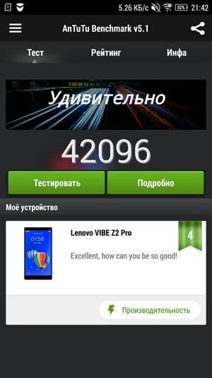 Lenovo Vibe Z2 Pro имеет мощную аккумуляторную батарею, ее емкость составляет 4000 мА·ч. Однако даже со столь большой батареей аппарат рекордов не поставил, показав достойные результаты, но не более того.