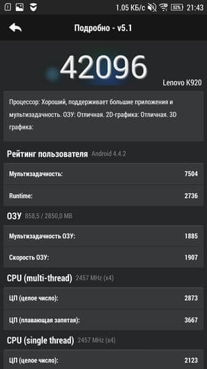 По результатам тестирования в бенчмарках смартфон показал себя одним из самых мощных и производительных современных мобильных аппаратов на рынке. В тесте AnTuTu испытуемый продемонстрировал более высокие результаты, чем некоторые общепризнанные мировые лидеры. Те, впрочем, были протестированы в более старой версии популярного бенчмарка, так что напрямую сравнивать эти результаты нельзя. Мы помечаем в табличках, в какой версии бенчмарка тестировалась та или иная модель. Впрочем, топовые смартфоны, основанные на Snapdragon 801, это, в любом случае, наиболее производительные на сегодняшний день мобильные аппараты на рынке, мощности которых еще долго будет хватать для выполнения любых поставленных задач.