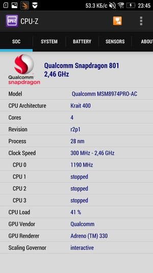 - SoC Qualcomm Snapdragon 801 (MSM8974АC), 4 ядра Krait 400, 2,5 ГГц