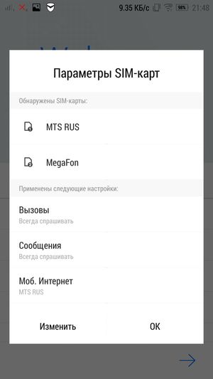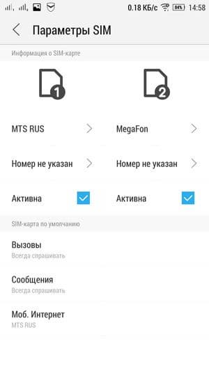 Смартфон поддерживает работу с двумя SIM-картами, и в целом работа с ними в меню организована по знакомому принципу: можно любую из SIM-карт назначить основной для организации голосовых звонков, или отправки SMS-сообщений. При наборе номера также можно выбрать желаемую карту прямо в меню телефонного интерфейса. Работа с двумя SIM-картами организована по привычному стандарту Dual SIM Dual Standby, когда обе карты могут находиться в активном режиме ожидания, но одновременно работать не могут — радиомодуль здесь только один.