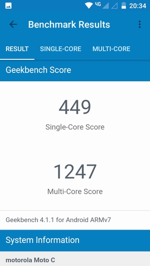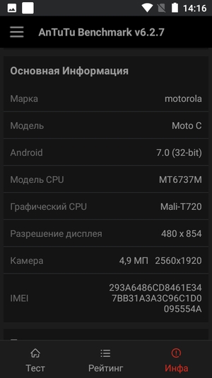 MediaTek MT6737 — одна из самых скромных по возможностям современных платформ для мобильных устройств начального уровня. Она и так-то совсем слабенькая, ориентирована на ультрабюджетный класс устройств, так к тому же здесь применяется ее ослабленная версия MT6737m с частотой ядер до 1,1 ГГц, а не 1,25 ГГц. Ждать от такой платформы достойных показателей производительности бессмысленно, герой обзора демонстрирует всего около 25 очков в AnTuTu, это совсем мало. Аппаратные возможности Moto C минимальны, смартфон во всех тестах показывает низкий уровень. Требовательные игры и графические тесты вызывают проблемы: например, Mortal Kombat X притормаживает, а старшие тесты 3DMark смартфон не проходит вовсе. Запаса мощи на будущее у такого аппарата точно нет.