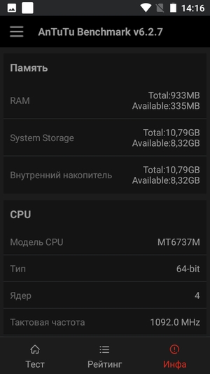 - SoC MediaTek MT6737m, 4 ядра @1,1 ГГц (ARM Cortex-A53)