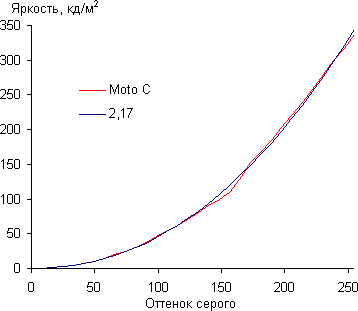 Контрастность (примерно в центре экрана и строго перпендикулярно ему) нормальная — порядка 600:1. Время отклика при переходе черный-белый-черный равно 27 мс (22 мс вкл. + 5 мс выкл.), переход между полутонами серого 25% и 75% (по численному значению цвета) и обратно в сумме занимает 51 мс. Построенная по 32 точкам с равным интервалом по численному значению оттенка серого гамма-кривая не выявила завала ни в светах, ни в тенях. Показатель аппроксимирующей степенной функции равен 2,17, что близко к стандартному значению 2,2. При этом реальная гамма-кривая заметно отклоняется от степенной зависимости: