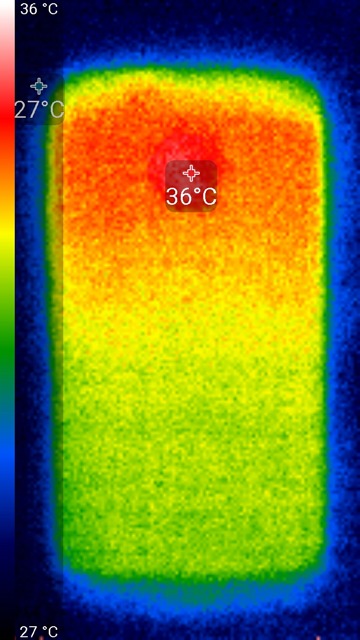 Нагрев больше локализован в верхней части аппарата, что, видимо, соответствует расположению микросхемы SoC. По данным теплокамеры, максимальный нагрев составил 36 градусов (при температуре окружающего воздуха в 24 градуса), это относительно немного.