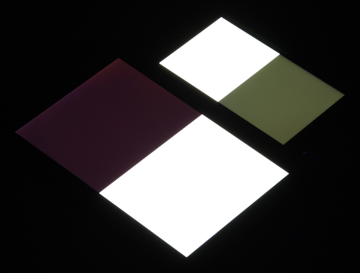 Яркость под углом у экранов уменьшилась (как минимум в 5 раз, исходя из разницы в выдержке), но в случае Moto G5 падение яркости чуть больше. Черное поле при отклонении по диагонали высветляется сильно и приобретает зеленоватый оттенок. Фотографии ниже это демонстрируют (яркость белых участков в перпендикулярном плоскости экранов направлении одинаковая!):
