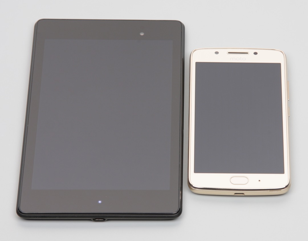Лицевая поверхность экрана выполнена в виде стеклянной пластины с зеркально-гладкой поверхностью, устойчивой к появлению царапин. Судя по отражению объектов антибликовые свойства экрана не хуже, чем у экрана Google Nexus 7 (2013) (далее просто Nexus 7). Для наглядности приведем фотографию, на которой в выключенных экранах отражается белая поверхность (слева — Nexus 7, справа — Moto G5, далее их можно различать по размеру):