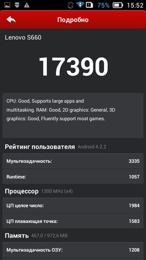 В целом, по результатам всех тестирований, Lenovo S660 можно отнести к разряду аппаратов со средней (даже чуть ниже среднего уровня) производительностью. В любом случае, на данный момент аппаратной производительности смартфона должно хватать для выполнения большинства основных задач, которые могут поставить приложения из Google Play Store, не считая разве что требовательных 3D-игр, но данный аппарат для них и не предназначен. Скромный по размеру и разрешению дисплей и при этом большая по емкости батарея выдают в нем скорее надежного бизнес-помощника, нежели мультимедийный комбайн для развлечений.