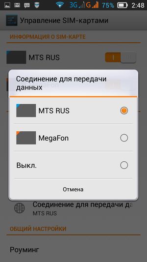 Смартфон поддерживает работу с двумя SIM-картами, и в целом работа с ними в меню организована по знакомому принципу: можно любую из SIM-карт назначить основной для организации голосовых звонков, передачи данных или отправки SMS-сообщений. При наборе номера также предоставляется возможность выбрать желаемую карту. С сетями 3G может работать SIM-карта в любом слоте, однако одновременно в этом режиме может работать лишь одна из карт (вторая будет работать только в 2G). Работа с двумя SIM-картами организована по привычному стандарту Dual SIM Dual Standby, когда обе карты могут находиться в активном режиме ожидания, но одновременно работать не могут — радиомодуль здесь только один.