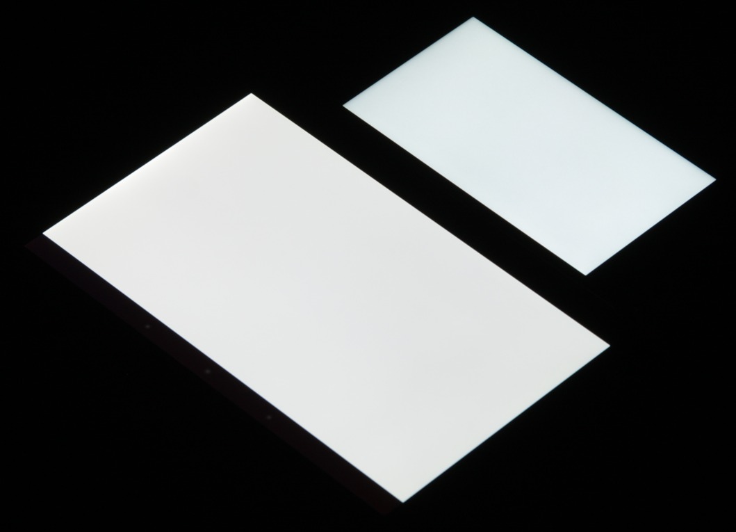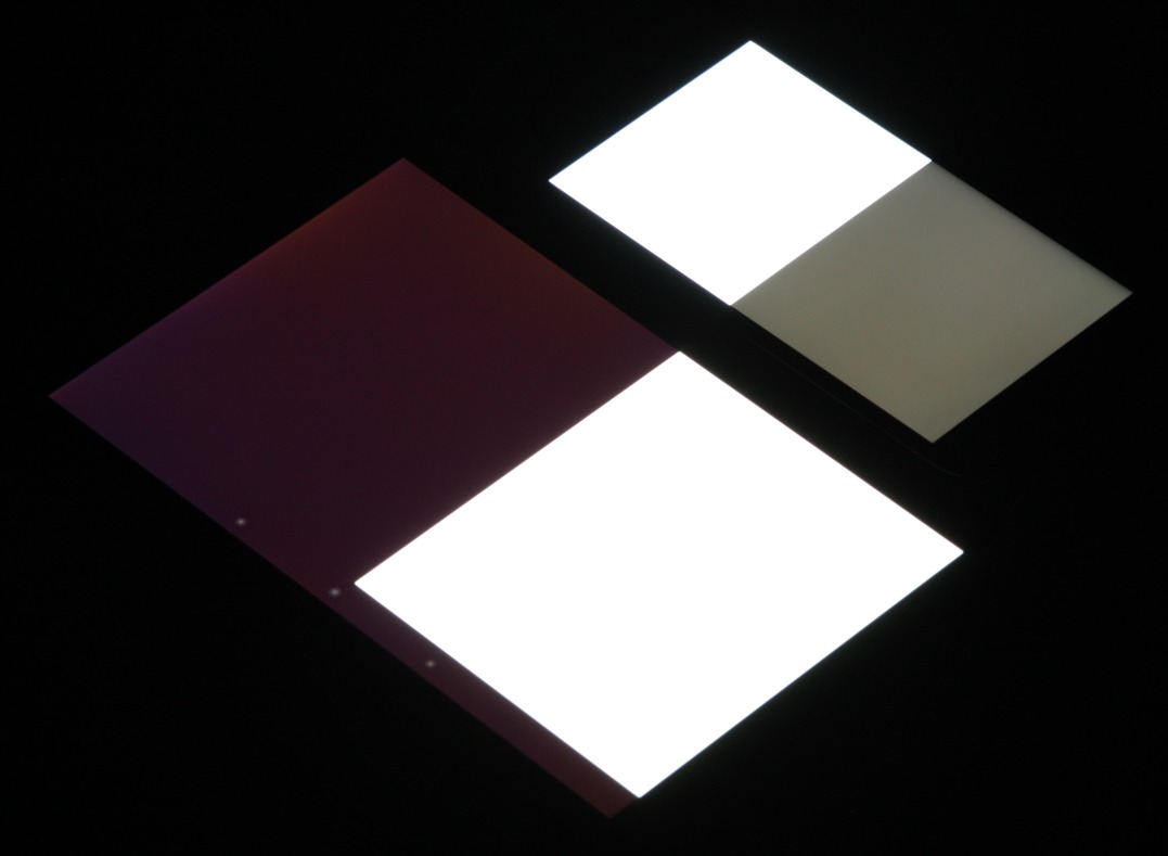 Яркость под углом у экранов уменьшилась (как минимум в пять раз, исходя из разницы в выдержке), и уменьшилась примерно на одинаковую величину. Черное поле при отклонении по диагонали высветляется сильно и приобретает фиолетовый оттенок или остается почти нейтрально-серым. Фотографии ниже это демонстрируют (яркость белых участков в перпендикулярном плоскости экранов направлении у экранов одинаковая!):