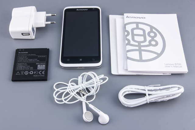 Смартфон Lenovo IdeaPhone S720 поставляется в коробке средних размеров, изготовленной из белого картона. Никакой интересной информации, помимо названия смартфона, на ней нет. Внутри упаковки находится пластиковый кейс, который, в свою очередь, содержит сам смартфон и его аксессуары. К ним относятся: зарядное устройство, кабель Micro-USB—USB, проводная стереогарнитура и документация на русском языке. Комплектация небогатая, но стандартная для бюджетного устройства.