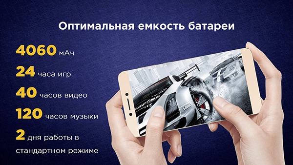 Встроенная батарея имеет емкость 4060 мА·ч, позволяет функционировать смартфону до 10 часов в режиме разговора и до 300 часов в режиме ожидания.
