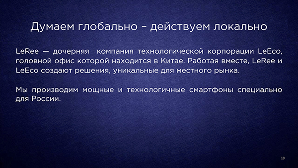Но вернемся к московской презентации. В ходе данного мероприятия российские журналисты имели возможность не только получить информацию и эксклюзивные комментарии о самом бренде, но также познакомиться поближе с первенцем продуктовой линейки марки LeRee — смартфоном Le 3, официальная цена которого, как и дата старта продаж на российском рынке, были объявлены тут же, во время представления новинки.