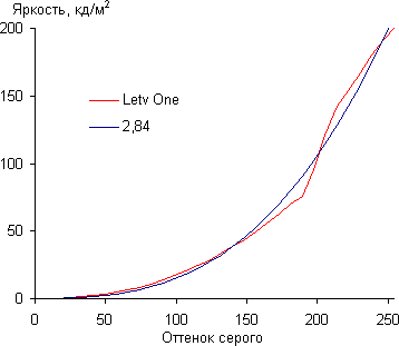 Контрастность (примерно в центре экрана) высокая — порядка 970:1. Время отклика при переходе черный-белый-черный равно 24 мс (12 мс вкл. + 12 мс выкл.). Переход между полутонами серого 25% и 75% (по численному значению цвета) и обратно в сумме занимает 39 мс. Построенная по 32 точкам с равным интервалом по численному значению оттенка серого гамма-кривая не выявила завала ни в светах, ни в тенях. Показатель аппроксимирующей степенной функции равен 2,84, что выше стандартного значения 2,2, впрочем, это не имеет никакого значения, так как реальная гамма-кривая заметно отклоняется от степенной зависимости: