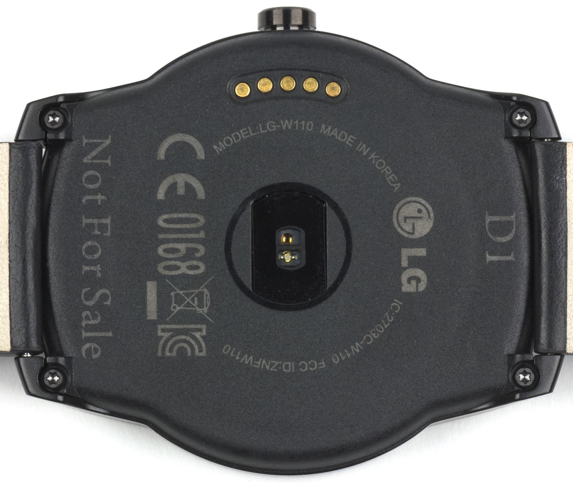 Здесь мы видим датчик измерения сердечного ритма и контакты для подсоединения к зарядному крэдлу. Разумеется, надписи Not For Sale на коммерческом образце не будет. На фото ниже — задние стороны LG G Watch R и Moto 360. У Moto 360 — тоже пластик, но только гладкий; для руки, впрочем, большой разницы нет, так как запястье с внешней стороны не очень чувствительно.