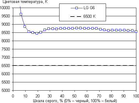 Баланс оттенков на шкале серого средний, так как цветовая температура заметно выше 6500 К, но хоть отклонение от спектра абсолютно черного тела (ΔE) меньше 10, что для потребительского устройства считается приемлемым показателем. При этом цветовая температура мало изменяется от оттенка к оттенку — это положительно сказывается на визуальной оценке цветового баланса. (Самые темные области шкалы серого можно не учитывать, так как там баланс цветов не имеет большого значения, да и погрешность измерений цветовых характеристик на низкой яркости большая.)