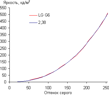 Контрастность (примерно в центре экрана) высокая — порядка 1390:1. Время отклика при переходе черный-белый-черный равно 18 мс (9 мс вкл. + 9 мс выкл.). Переход между полутонами серого 25% и 75% (по численному значению цвета) и обратно в сумме занимает 32 мс. Построенная по 32 точкам с равным интервалом по численному значению оттенка серого гамма-кривая не выявила завала ни в светах, ни в тенях. Показатель аппроксимирующей степенной функции равен 2,38, что немного выше стандартного значения 2,2. При этом реальная гамма-кривая чуть-чуть отклоняется от степенной зависимости: