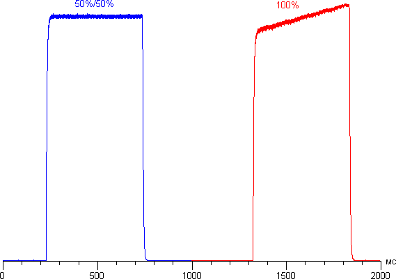 В данном смартфоне есть неотключаемая динамическая подстройка яркости подсветки в соответствии с характером выводимого изображения. Поэтому ряд тестов — определение контрастности и времени отклика, сравнение засветки черного под углами — мы проводили при выводе специальных шаблонов с неизменной средней яркостью, а не однотонных полей во весь экран. Приведем зависимость яркости (вертикальная ось) от времени при переключении с черного поля на белое в половинах экрана попеременно, при этом средняя яркость не меняется и динамическая подстройка яркости подсветки не работает (график 50%/50%). И та же зависимость, но при попеременном выводе полей во весь экран (график 100%), при этом средняя яркость уже меняется и динамическая подстройка яркости подсветки делает свое дело: