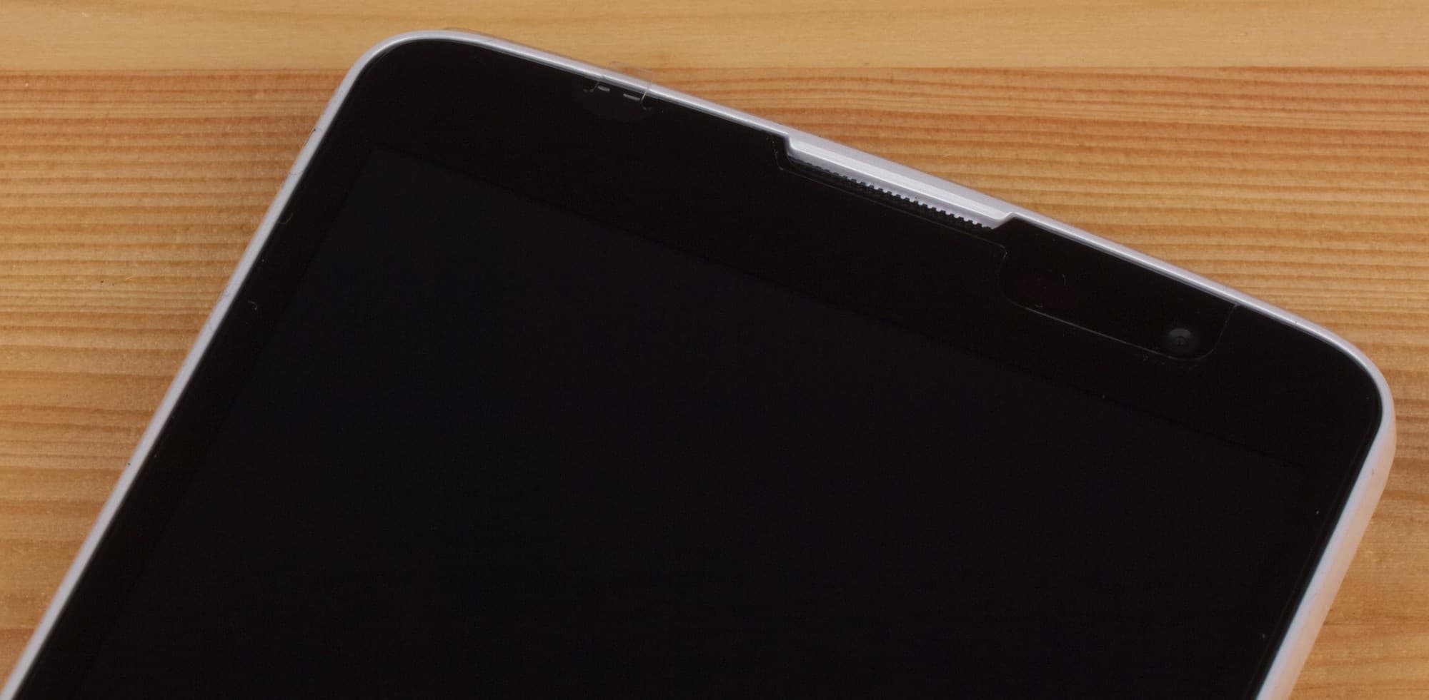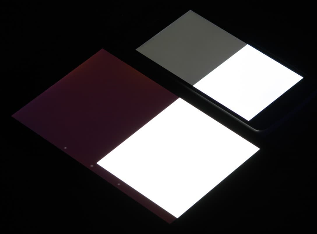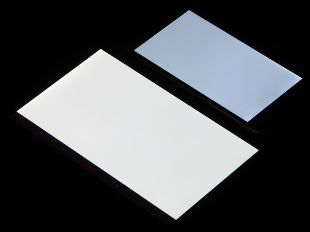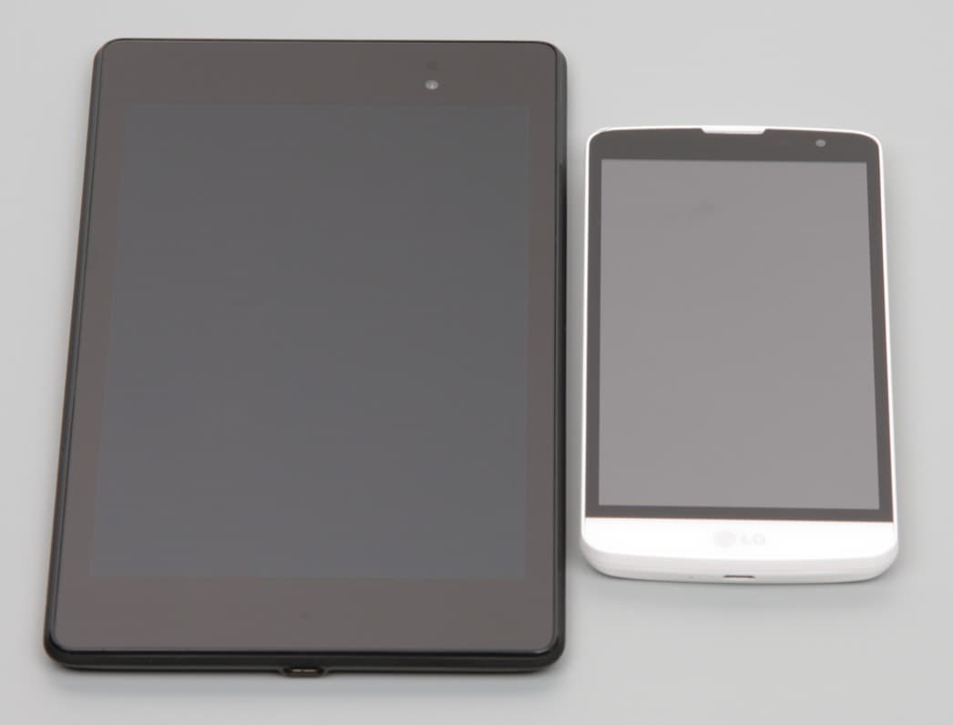 Лицевая поверхность экрана выполнена в виде стеклянной пластины с зеркально-гладкой поверхностью, устойчивой к появлению царапин. Судя по отражению объектов антибликовые свойства экрана заметно хуже, чем у экрана Google Nexus 7 (2013) (далее просто Nexus 7). Поверхность самой матрицы под стеклом слегка матовая, поэтому экран отражает как прямые источники света (внешней поверхностью), так и рассеянный свет (поверхностью матрицы), это уменьшает читаемость в условиях сильной внешней засветки. Для наглядности приведем фотографию, на которой в выключенных экранах отражается белая поверхность (слева — Nexus 7, справа — LG L Bello, далее их можно различать по размеру):