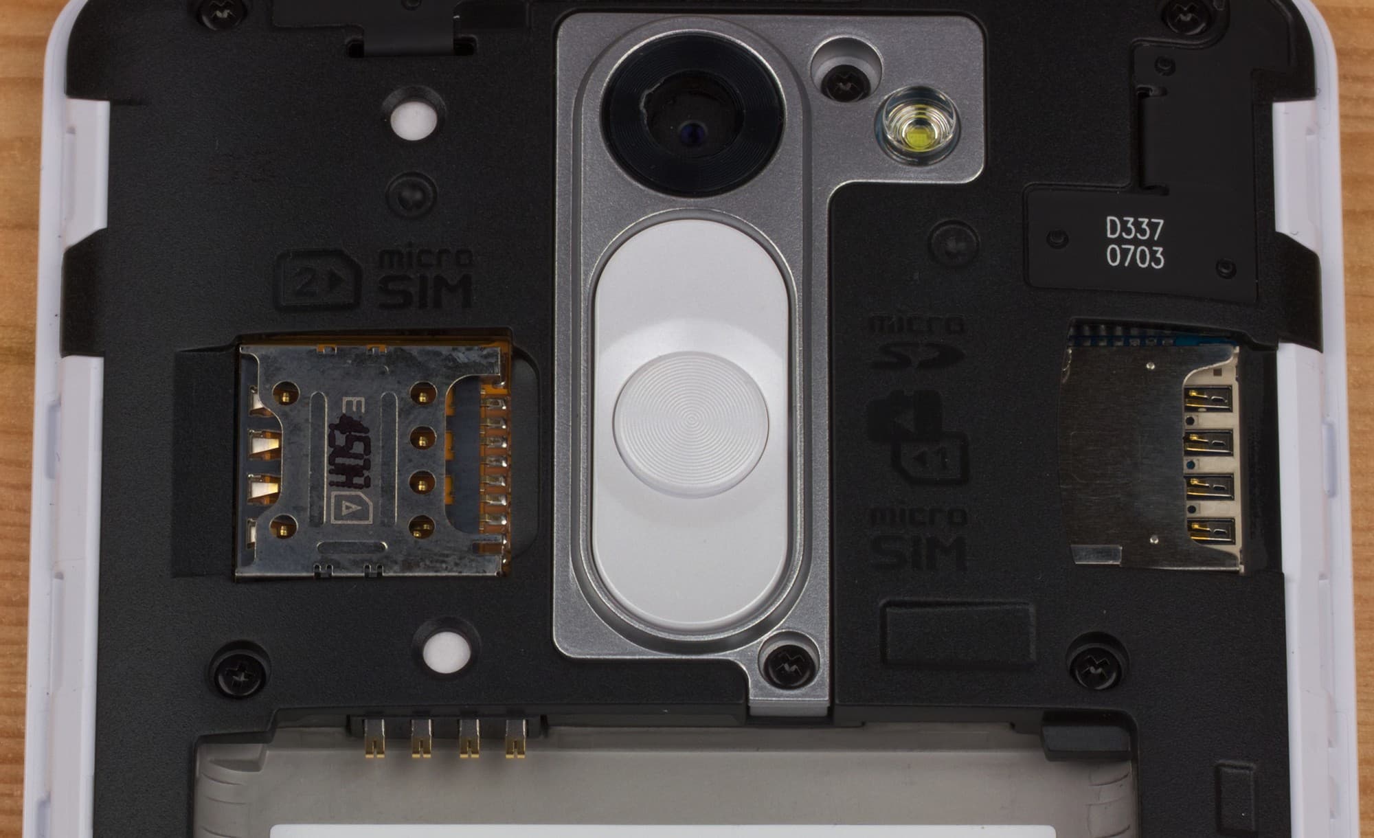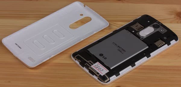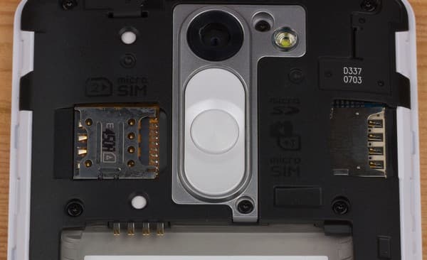 Под крышкой у LG L Bello скрываются слоты для двух карточек Micro-SIM и карты памяти, все они доступны без необходимости снятия аккумулятора. В этом и во многом другом кроются существенные отличия внутренного строения корпусов LG L Fino и L Bello: у младшей модели слоты для SIM-карт сверху прикрываются съемной аккумуляторной батареей, без изъятия которой заменить карточки нельзя.
