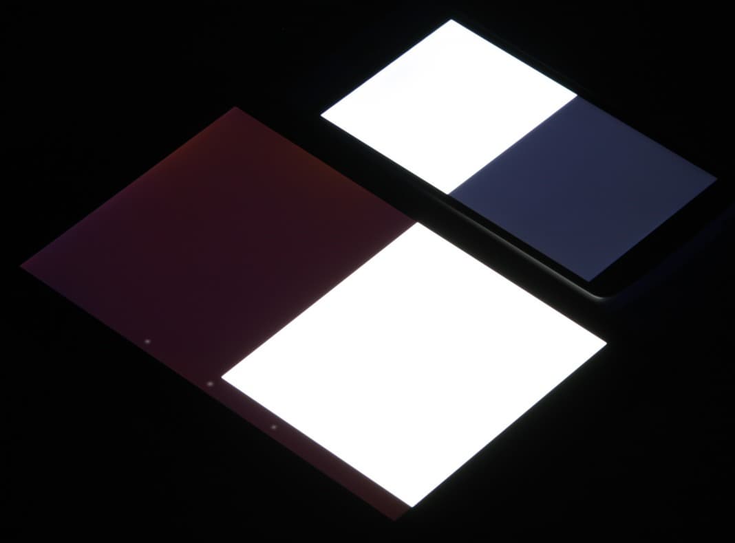 Цветопередача хорошая и цвета выглядят насыщенными у обоих экранов, хотя цветовой баланс несколько различается. Теперь под углом примерно 45 градусов к плоскости и к стороне экрана: