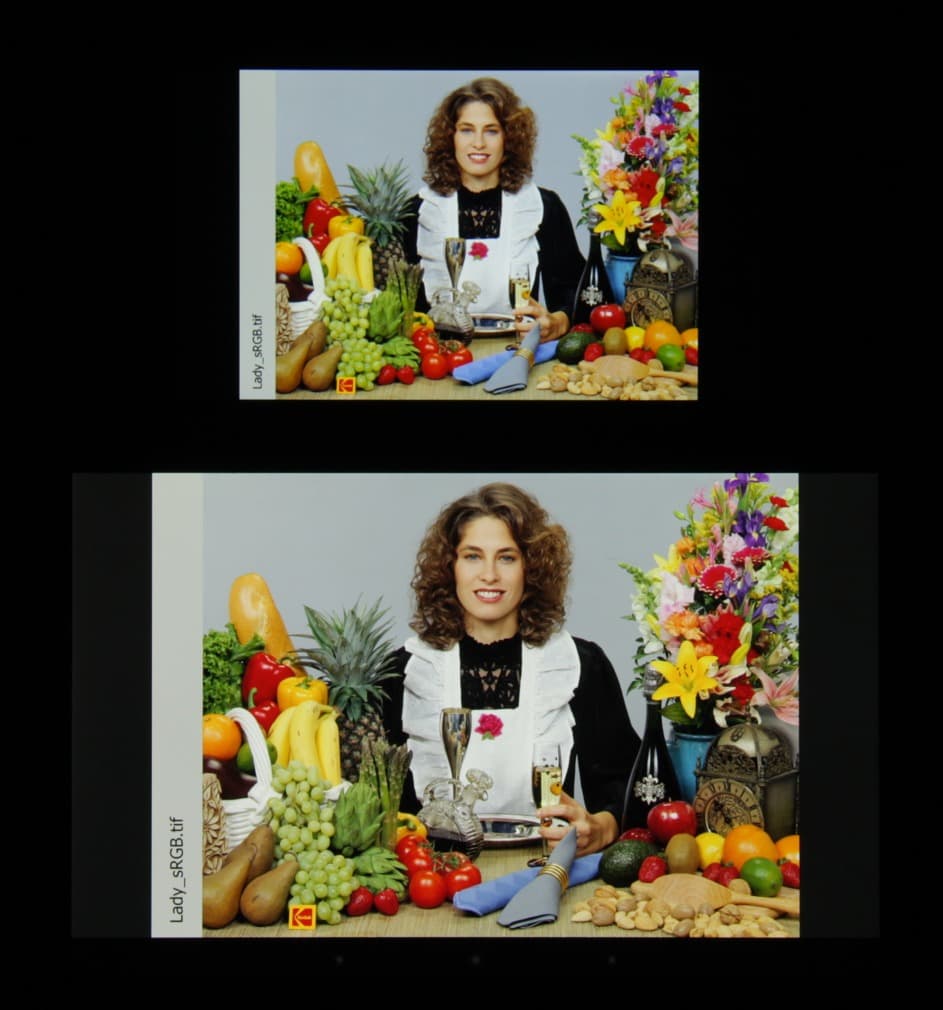Однако координаты первичных цветов достаточно близки к вершинам треугольника sRGB, поэтому цвета выглядят насыщенными и естественными. Баланс оттенков на шкале серого хороший, так как цветовая температура несильно выше стандартных 6500 К, а отклонение от спектра абсолютно черного тела (ΔE) меньше 10 (или немного больше), что для потребительского устройства считается хорошим показателем. При этом как цветовая температура, так и ΔE мало изменяются от оттенка к оттенку — это положительно сказывается на визуальной оценке цветового баланса. (Самые темные области шкалы серого можно не учитывать, так как там баланс цветов не имеет большого значения, да и погрешность измерений цветовых характеристик на низкой яркости большая.)
