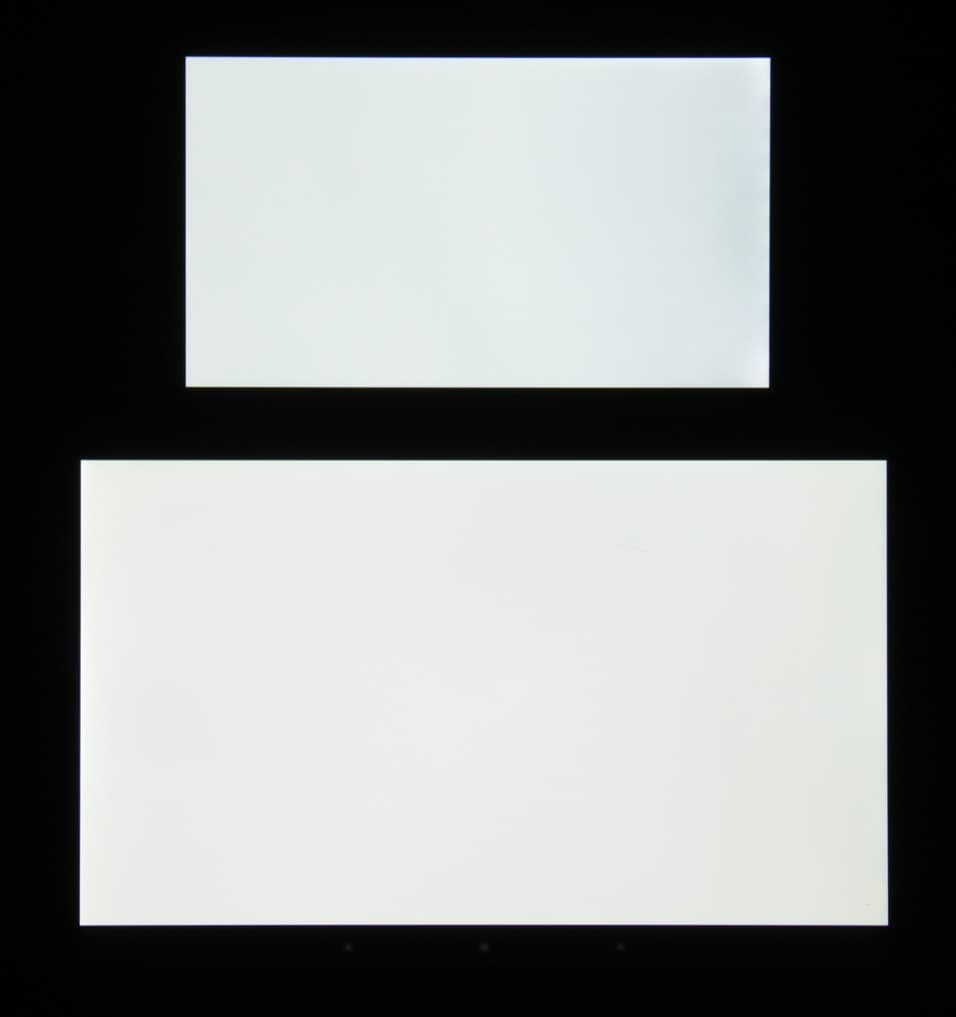 Яркость под углом у экранов уменьшилась (как минимум в 5 раз, исходя из разницы в выдержке), но в случае LG L Bello падение яркости больше. Черное поле при отклонении по диагонали высветляется сильно и приобретает фиолетовый оттенок или остается почти нейтрально-серым. Фотографии ниже это демонстрируют (яркость белых участков в перпендикулярном плоскости экранов направлении примерно одинаковая!):