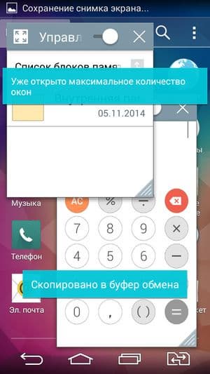Функция QSlide позволяет делать рабочие окна меньше, отцеплять их, перемещая по экрану, а также менять степень их прозрачности и количество. Уменьшенные окна продолжают функционировать в полной мере: например, в таком окошке может проигрываться видео. Если увеличить степень прозрачности окон до максимума, то элементы других окон, проглядывающие сквозь них, становятся интерактивными. В данном аппарате можно одновременно задействовать лишь до двух окон QSlide.
