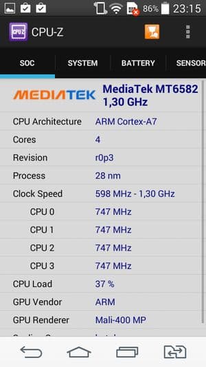 - SoC MediaTek MT6582, 1,3 ГГц, 4 ядра, ARM Cortex-A7