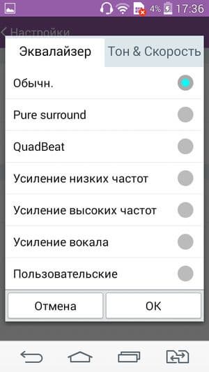 В настройках штатного музыкального проигрывателя имеется возможность использовать некоторые программные аудиоэффекты, задействовать предустановленные настройки эквалайзера, но сделать это можно лишь при подключении наушников. Этим смартфон выгодно отличается от младшей модели, у которой вовсе нет никаких дополнительных звуковых возможностей.