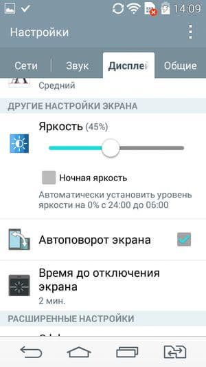 Яркость дисплея имеет только ручную регулировку, автоматической, в худших традициях бюджетных аппаратов L-серии, здесь, как и прежде, нет, хотя есть некий ее заменитель: возможность автоматического уменьшения уровня яркости дисплея до нулевого значения по времени. Есть датчик приближения, который блокирует экран при поднесении смартфона к уху. Технология мультитач, в отличие от младшей модели, позволяет обрабатывать лишь 5, а не 10 одновременных прикосновений. Боковые рамки вокруг экрана достаточно широкие — расстояние от края корпуса до края экрана с боков составляет более 4 мм. Экран можно разбудить и усыпить обратно с помощью двойного постукивания по стеклу.