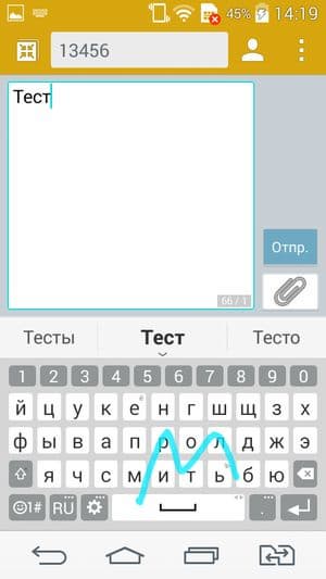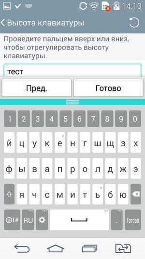 Прорисовка букв и цифр виртуальных клавиатур достаточно крупная, есть возможность изменить высоту букв, уменьшить ширину, а также задействовать кое-какие другие улучшения, например реорганизовать по своему усмотрению нижний ряд кнопок. Раскладка и расположение клавиш стандартные: переключение языков здесь осуществляется нажатием на специальную кнопку. Также очень удобно наличие выделенного верхнего ряда с цифрами — нет необходимости каждый раз переключать раскладку, виртуальная клавиатура младшей модели такого удобства лишена в силу меньшего количества места на экране. Телефонное приложение поддерживает Smart Dial, то есть во время набора телефонного номера сразу осуществляется и поиск по первым буквам в контактах. Для любителей Swype предусмотрен метод безотрывного ввода росчерком от буквы к букве (Path input). В целом, возможности работы с виртуальной клавиатурой в LG L Bello максимально широки, буквально все пользователь может подстроить под себя.