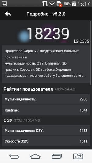 По результатам тестирования в бенчмарках смартфон LG L Bello ожидаемо можно отнести к разряду аппаратов со средним уровнем производительности, типичным для данной платформы. В целом, на текущий момент аппаратной производительности смартфона должно хватать для выполнения большинства основных задач, которые могут поставить приложения из Google Play Store, не считая самых требовательных игр, так как видеоподсистема испытуемого демонстрирует достаточно скромные результаты в специализированных графических тестах.