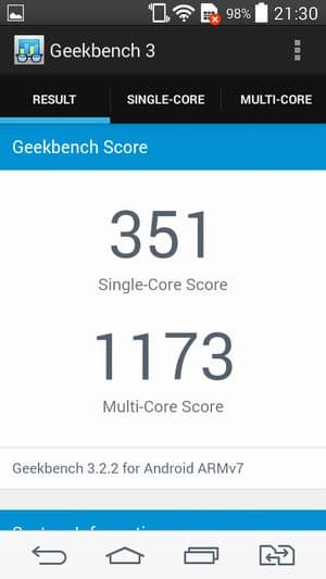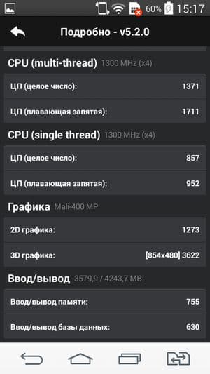 Если сравнивать результаты производительности героя обзора с другими близкими по характеристикам смартфонами, то можно удостовериться в том, что смартфон демонстрирует абсолютно типичную для своего уровня производительность. Его результаты практически идентичны результатам другого смартфона на той же самой платформе, прошедшего тестирование в одних и тех же версиях бенчмарков (Acer Liquid Jade). Более продвинутая платформа того же самого производителя с восемью ядрами (MediaTek MT6592) закономерно демонстрирует более высокие результаты в аналогичных тестах (Fly Ego Art 2), а устаревшая морально MT6589T также вполне логично показывала в прошлом более низкие результаты (Lenovo Vibe X).