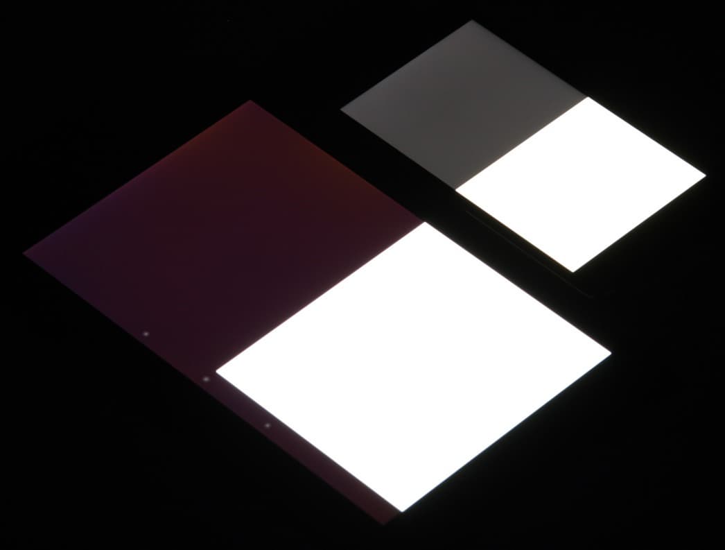 Яркость под углом у экранов уменьшилась (как минимум в 5 раз, исходя из разницы в выдержке), но в случае LG L Fino падение яркости больше. Черное поле при отклонении по диагонали высветляется сильно и приобретает фиолетовый оттенок или остается почти нейтрально-серым. Фотографии ниже это демонстрируют (яркость белых участков в перпендикулярном плоскости экранов направлении примерно одинаковая!):