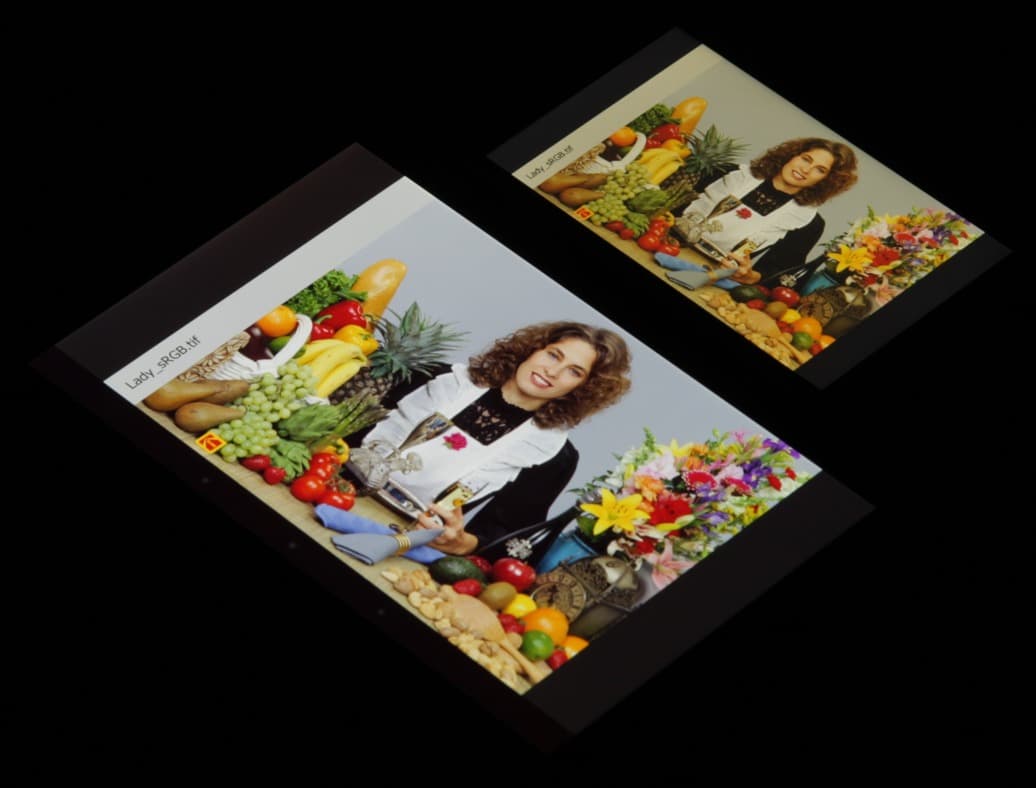 Цветопередача хорошая и цвета выглядят насыщенными у обоих экранов, хотя яркостный баланс заметно различается. Теперь под углом примерно 45 градусов к плоскости и к стороне экрана: