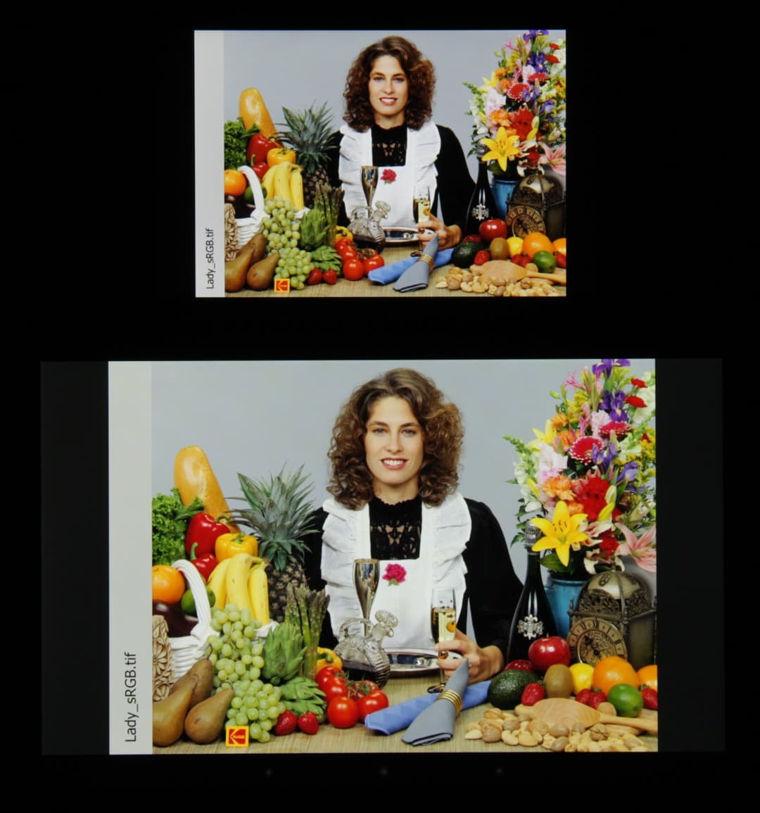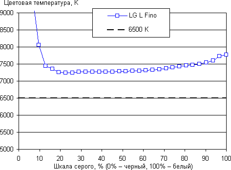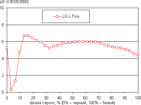 Однако уменьшение насыщенности частично компенсируется увеличением видимой контрастности (S-образная гамма-кривая), поэтому на приведенной выше фотографии цвета не выглядят бледными (но и изображение слишком контрастное). Баланс оттенков на шкале серого хороший, так как цветовая температура несильно выше стандартных 6500 К, а отклонение от спектра абсолютно черного тела (ΔE) меньше 10, что для потребительского устройства считается хорошим показателем. При этом как цветовая температура, так и ΔE мало изменяются от оттенка к оттенку — это положительно сказывается на визуальной оценке цветового баланса. (Самые темные области шкалы серого можно не учитывать, так как там баланс цветов не имеет большого значения, да и погрешность измерений цветовых характеристик на низкой яркости большая.)