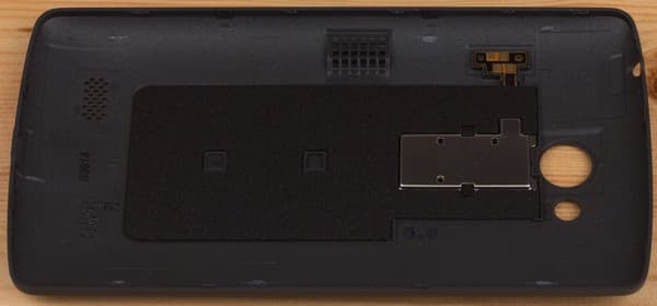 Под крышкой у LG L Fino скрываются слоты для двух карточек Micro-SIM и карты памяти, все это сверху прикрывается съемной аккумуляторной батареей, без изъятия которой заменить SIM-карты нельзя. В этом и во многом другом кроются существенные отличия внутренного строения корпусов LG L Fino и L Bello: у старшей модели ни один из слотов батареей не прикрыт, карточки доступны без необходимости снятия аккумулятора.