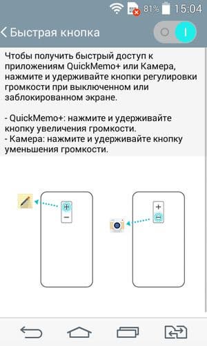 Что касается самих кнопок, то назначение их осталось прежним: центральная клавиша отрабатывает включение и блокировку смартфона, а две других, сверху и снизу, отвечают за регулирование громкости. Расширенные возможности блока аппаратных кнопок обеспечивают дополнительную функциональность в управлении: долгое удержание верхней кнопки запускает приложение Qmemo, нижней — вызывает камеру из спящего режима, а долгое нажатие центральной кнопки активирует съемку фото или видео. Ни одна из кнопок не выпирает за пределы корпуса, это оберегает от непредумышленных нажатий.