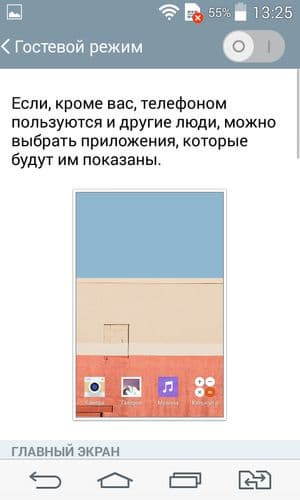 Как и у топовых флагманов последнего поколения, здесь есть возможность пробуждения и усыпления устройства постукиванием по экрану (KnockOn). Разработчики считают эту функцию столь сильной стороной своих аппаратов, что с обновлением софта они добавили эту возможность большинству своих смартфонов, даже бюджетных. Более того, не остановившись на достигнутом, разработчики LG продолжили развивать эту тему: в новых аппаратах корейской компании появилась расширенная версия функции KnockOn, которая называется Knock Code. С ее помощью можно установить пароль, в основе которого — выбор точки касания экрана. Помимо этого, в аппарате присутствует гостевой режим, после активации которого можно без опасения доверить свой смартфон другому лицу.
