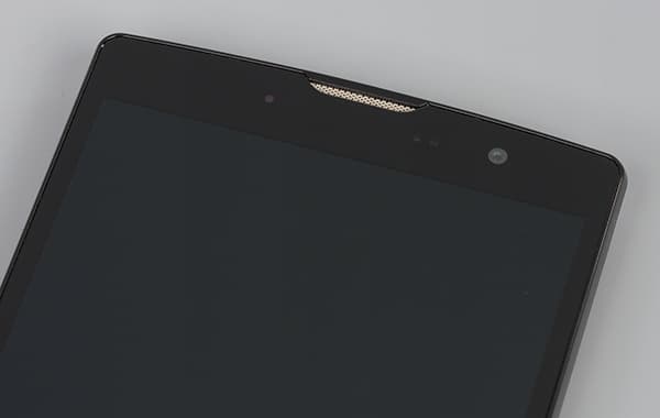 Передняя сторона смартфона полностью прикрыта защитным стеклом, которому придали слегка изогнутую форму. Стекло, надо заметить, имеет лишь слабо выраженные жироотталкивающие свойства: отпечатками пальцев оно покрывается быстро, а очищается тяжело. В верхней части над экраном в стекле можно обнаружить прорезь для разговорного динамика, забранную металлической решеткой. Рядом виднеется глазок фронтальной камеры и сенсоры. Здесь же размещен и светодиодный индикатор оповещений, светящий разными цветами — его функции регулируются в соответствующем разделе настроек.
