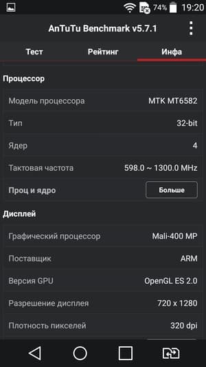 - SoC MediaTek MT6582, 1,3 ГГц, 4 ядра ARM Cortex-A7